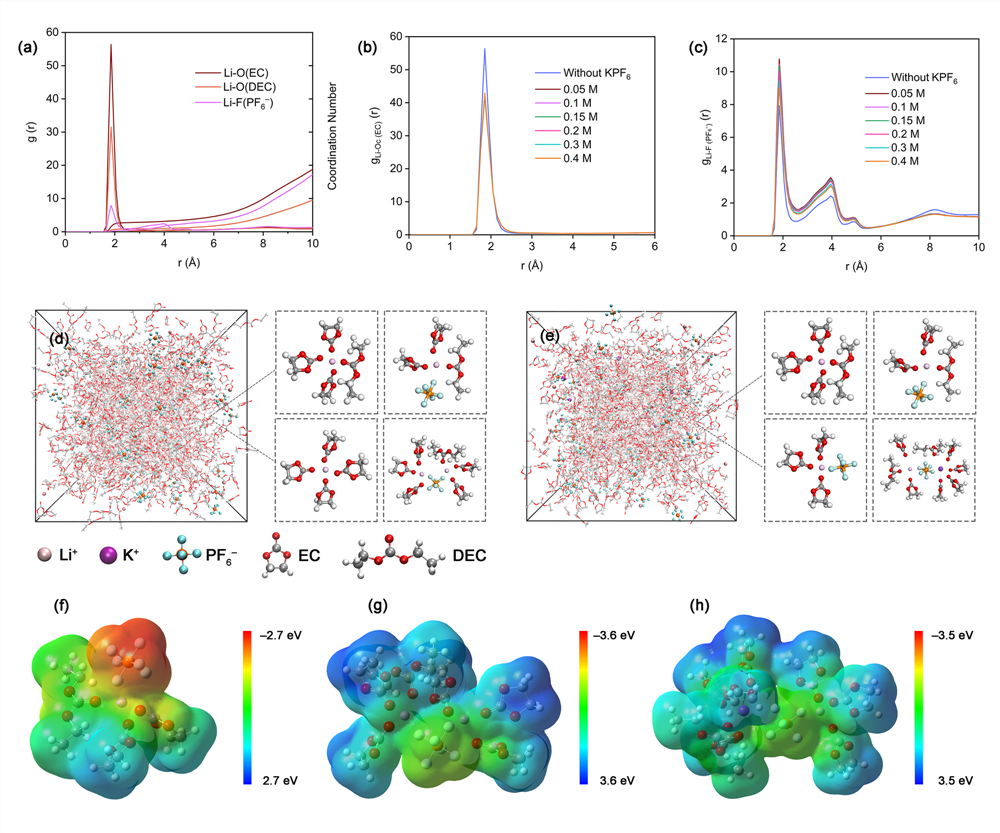 通过径向分布函数和静电势分析,揭示了KPF6添加剂如何增强PF6⁻与Li⁺的配位,促进小型聚集体的形成。