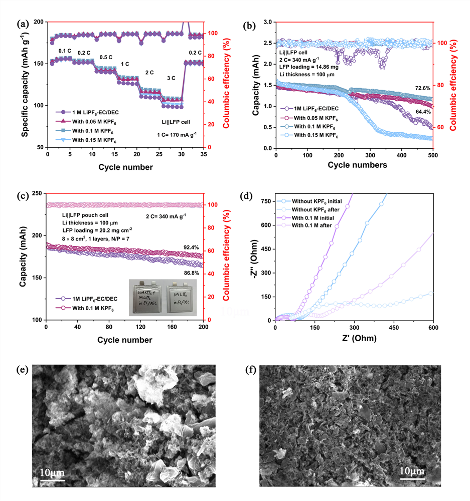 KPF6添加剂显著提升电池倍率性能与循环稳定性,并促进形成均匀锂沉积层。