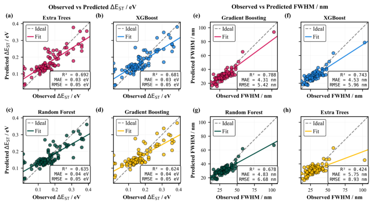 Fig. 3. Comparison of ML models for predicting ΔEST and FWHM. (a-d) Parity plots for ΔEST predictions. (e-h) Parity plots for FWHM predictions.