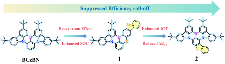 在生成所得的候选分子中,15个结构在化学空间分布上与原始训练集差异显著,其ΔEST分布于0.13–0.33 eV,FWHM集中于26.2–46.6 nm,显示出较小的能隙与较高的色纯度。理论计算进一步揭示,其中两种含硫的BCzBN衍生物在激发态动力学方面表现突出,其自旋–轨道耦合、反系间窜越速率及效率滚降性能均优于结构相似的BCzBN分子,证实了生成结构在光电性能上的优化潜力。该研究初步实现了从文献挖掘、分子生成到性能筛选的一体化MR-TADF智能设计平台,为发展高性能窄谱发射材料提供了新的研究方法与实现路径。
