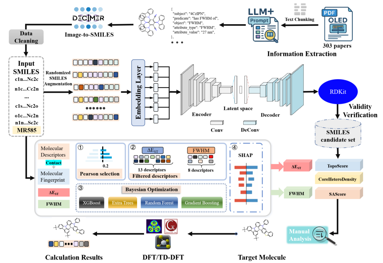 为满足高分辨显示器对色纯度的迫切需求,多重共振型热活化延迟荧光(MR-TADF)材料因其可同时实现高激子利用率与窄带发射的特性,成为OLED领域的研究热点。然而,该类材料的光物理过程对分子结构高度敏感,机理复杂,传统“试错”式研发模式面临成本高、周期长等瓶颈问题。为此,吉林大学邹陆一教授团队发展了一套覆盖数据获取、分子生成与性能预测全流程的智能框架,以实现MR-TADF材料的系统化与定向化设计。该研究成果以 “Data-driven generation and efficient screening of MR-TADF materials”为题发表于Chinese Chemical Letters。