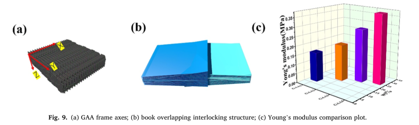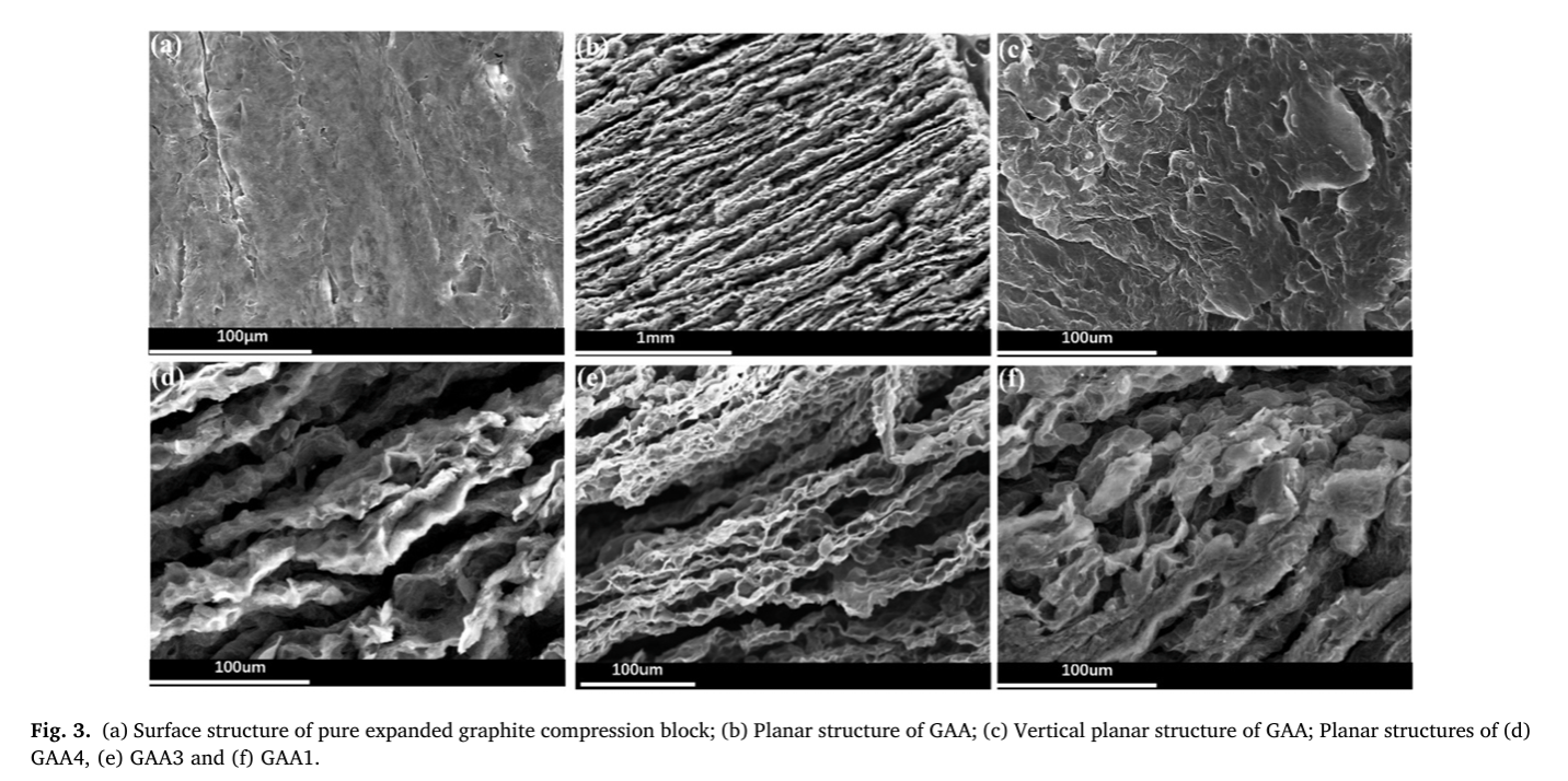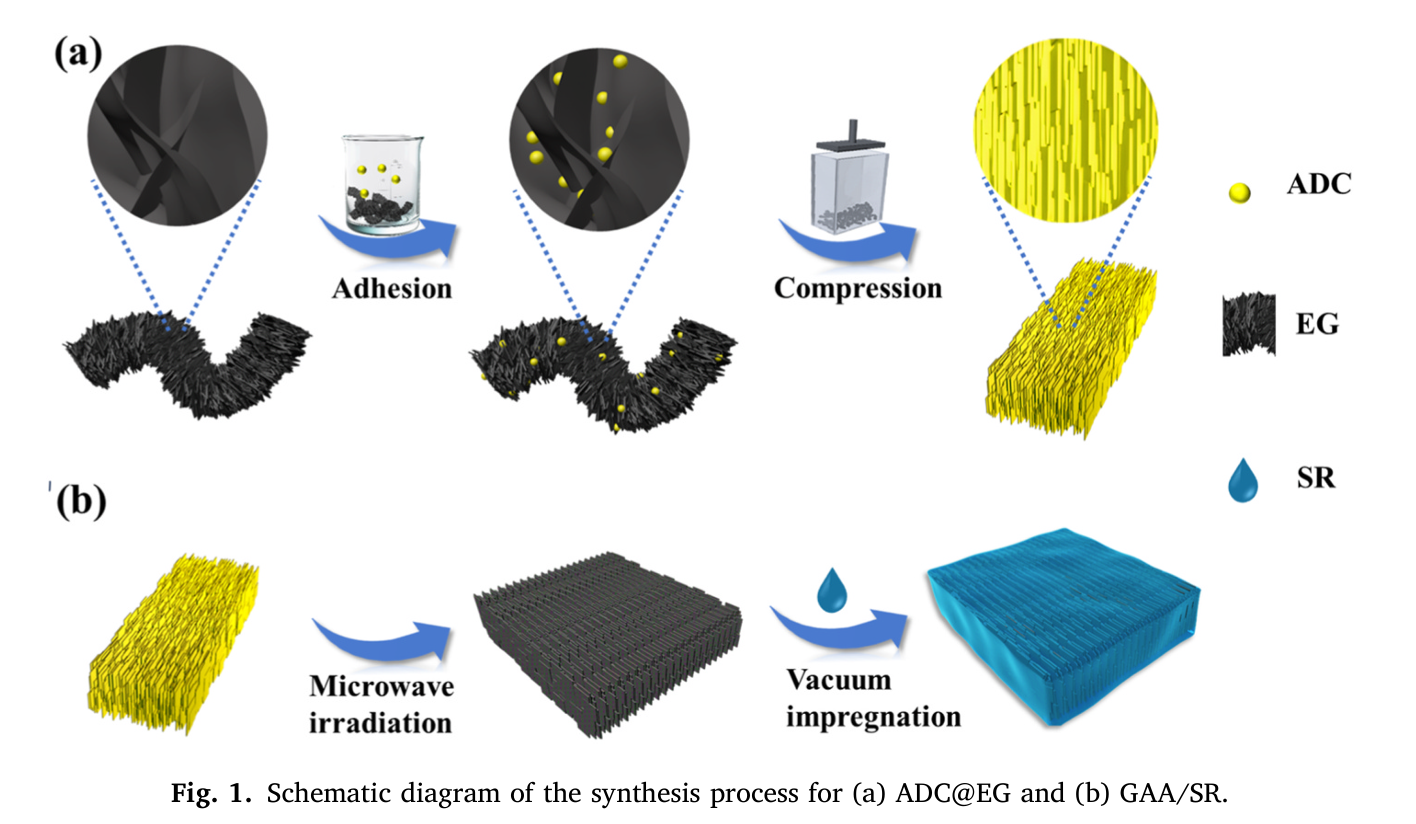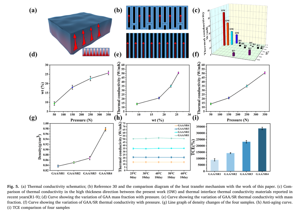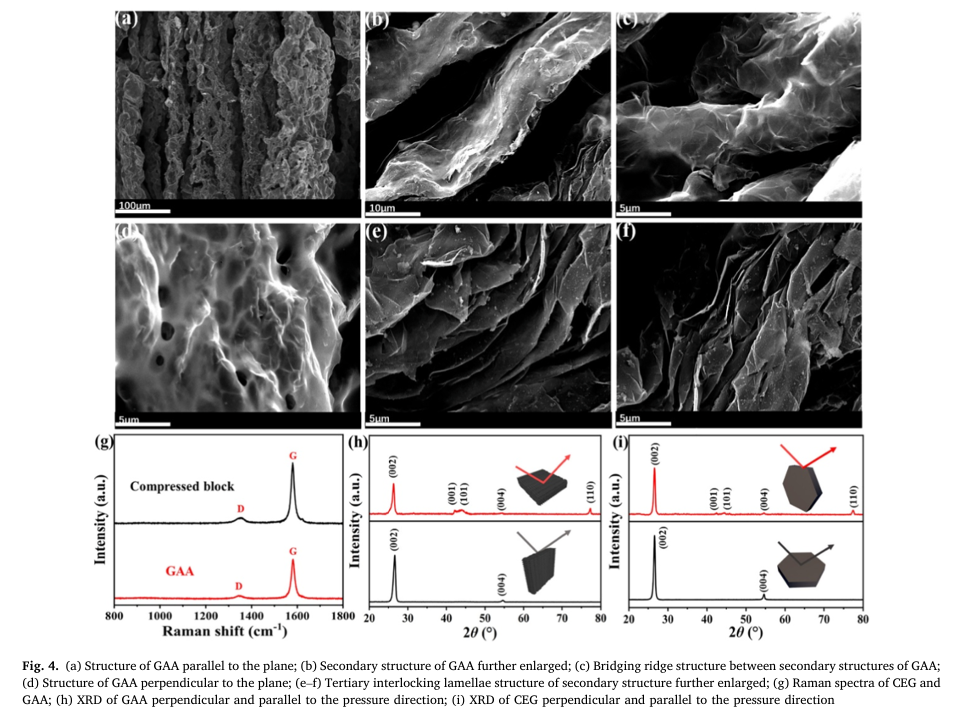 该研究以膨胀石墨为原料,将其与发泡剂ADC均匀混合后单轴压缩,使石墨片层沿压力垂直方向择优取向,再经微波辐照触发ADC定向分解产气,驱动压块沿压缩轴可控膨胀,快速构筑垂直排列的GAA三维骨架,最后通过真空浸渍将硅橡胶充分渗入骨架孔隙并固化,得到目标复合材料。整个制备流程耗时短、能耗较传统方法降低80%以上,具备规模化制备潜力。所制备的GAA框架呈现独特三级阵列结构,石墨片层高度互锁、结晶度高、结构缺陷少,既形成连续贯通的面外导热通路,又拥有开放孔道利于聚合物浸润,赋予复合材料优异的导热与力学协同特性。