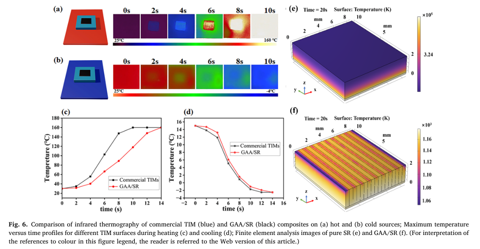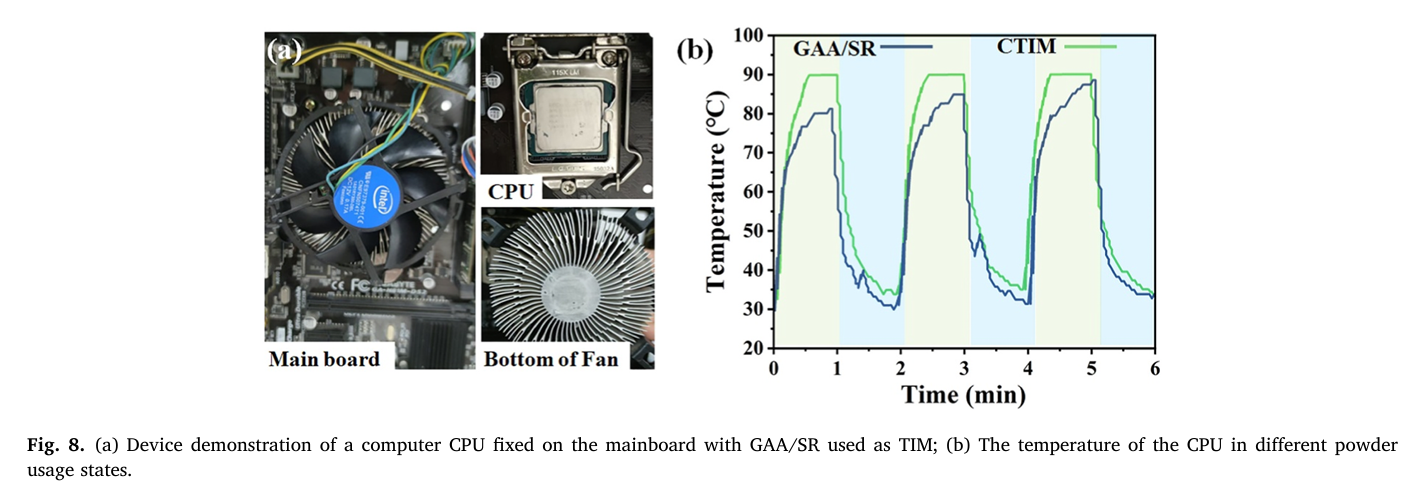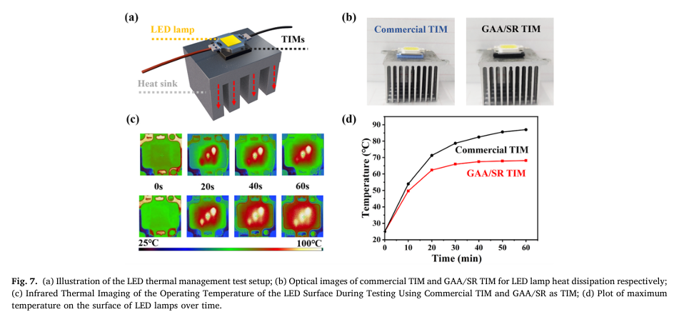 性能测试表明,GAA/SR复合材料的面外导热率高达50.621 W/(m・K),在25.7 wt%的低填料负载下,导热增强率(TCE)达到33647%,密度仅0.983 g/cm³,同时展现出显著的力学各向异性,兼顾承载刚性与界面柔性。加速老化实验显示,材料在30–60℃环境下长期存放,热导率波动小于3%,具备优异的热稳定性。在LED与CPU实际热管理场景中,该复合材料相较商用热界面材料,可使器件表面温度降低20–30℃,高负载下CPU核心温度更低、降温速率更快,有效缓解器件过热问题。